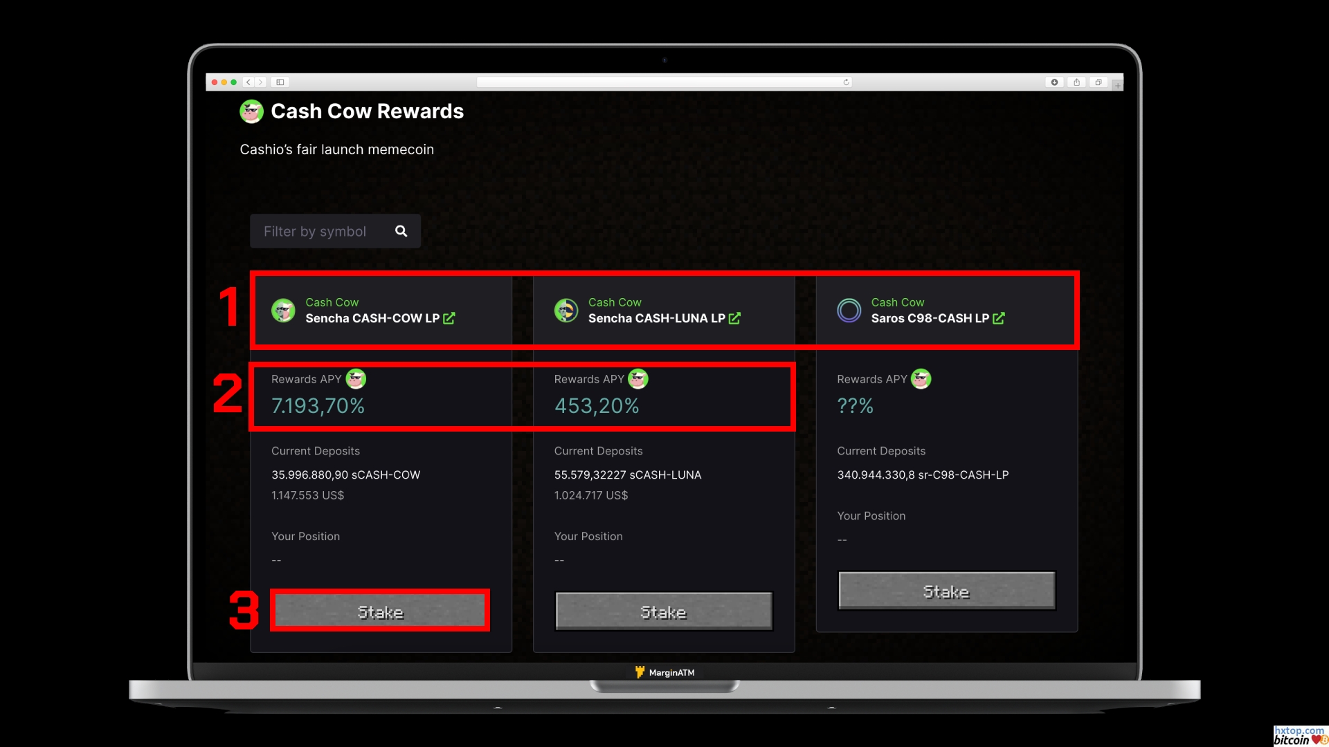 第 3 步:这里将出现许多不同的矿池 (1) 用于生产 Cow 。此外,你还可以根据该池的 APY (2) 比率来考虑,选择合适的池时→选择“Stake”。