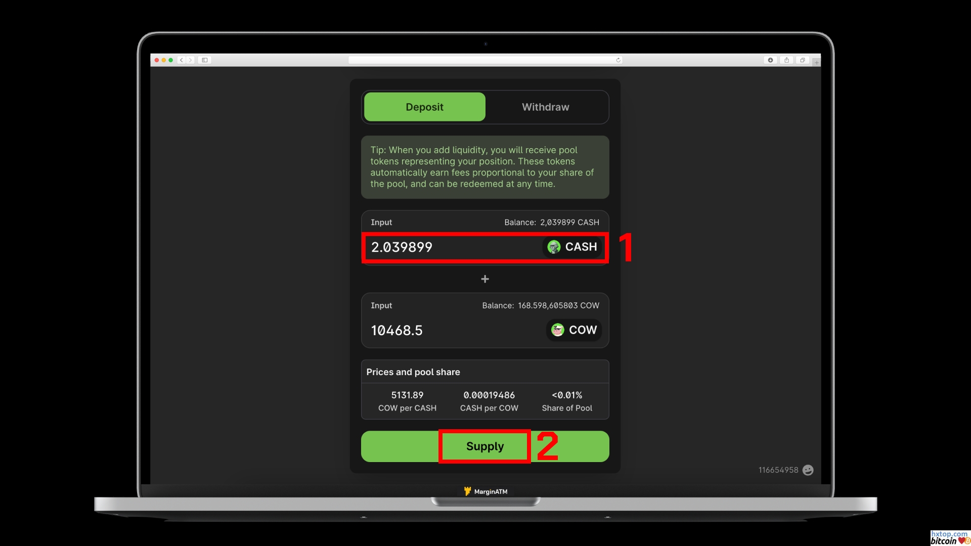 第 5 步: Quarry 会将你重定向到 Sencha 的网站。在这里你将添加 50% 的 Cash (1) 和 50% Cow → 选择“Supply” (2) 以存入您需要的一对 LP → 选择“Confirm Deposit” 进行确认。