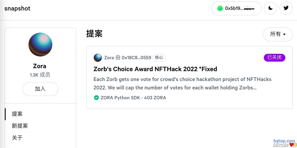 三、参与社区治理 参考其他项目的空投规则,社区治理也是重要维度。假如你已经持有NFT,建议多参与社区投票等活动。 目前,Zora在snapshot上的首次投票已经结束,后续可持续关注https://snapshot.org/#/zora.eth,一旦有新的提案,尽管参与即可。注意:一定要用持有NFT的钱包投票。