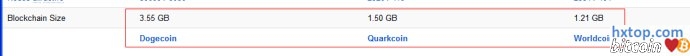 有比较广泛公信力的圈内大V说:“因为狗币1分钟出块时间,所以导致狗币的blockchain增长,这是狗币致命伤”其实任何人判断这句话是否成立,我们只需找一些反证便可,例如:“现存有出块时间更快的币种,有否因为出块时间而导致blockchain增大?比如 Worldcoin 15秒一个块,Quarkcoin 30秒一个块会否导致它们的blockchain急速增长?”我们来看一组数据:答案是没有的,我们可以看到,现存出块更快的币种blockchain并没有超过狗币。