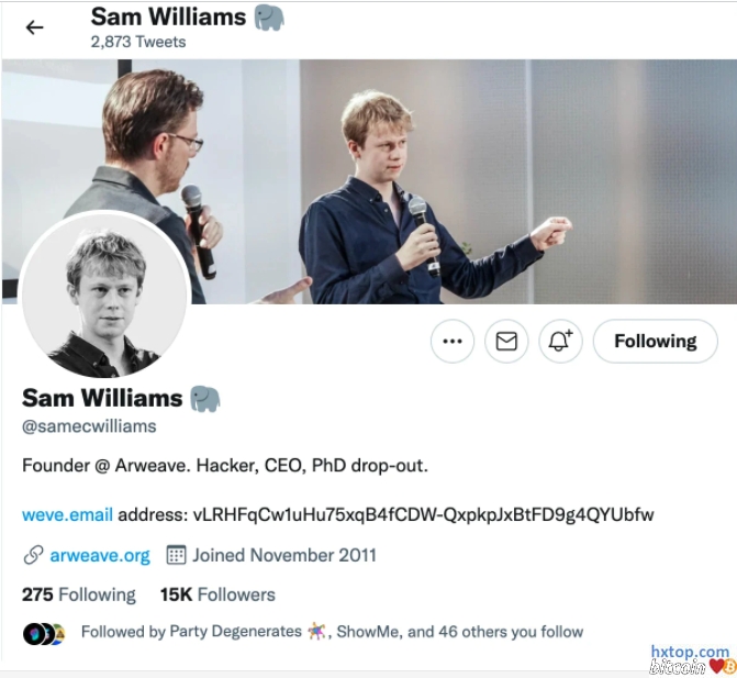 项目简介Arweave 是个非典型或非主流方向的区块链项目,我们之前对其一无所知,稍有了解的人,可能也就是把它看作是众多类似 Filecoin 的去中心化存储项目之一。所以也造成了之前我们对Arweave的一些忽视,今天就好好的把整个项目重新再认识一下。 Arweave 协议的愿景是提供去中心化、可扩展和永久的链上数据存储(永存);就像以太坊被认为是世界计算机,Arweave 可以被认为是永远不会忘记的世界硬盘。 创始人Arweave创始人兼CEO—Sam Williams是去中心化爱好者,在分布式系统设计和实施方面具有丰富的经验。英国人,黑客,博士,目前推特关注者15K。