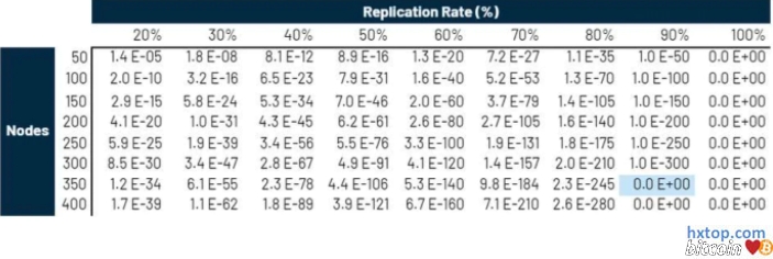 到这里的话我们可能会有疑问,采用这种非强制性存储所有资料的方式,那如果恰好所有节点都没有存储某个区块,那这个区块不就永久丢失了吗?确实是这样的,这个可能性是存在的。不过,我们如果简单算一下就知道单一区块永久丢失的概率是多大?