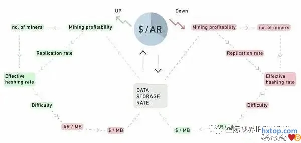 Arweave 有更直接的方法。总存储成本基于我之前讨论的 200 年存储估计成本(今天的存储成本每年降低 0.5%)。它的存储成本根据 AR 波动,以实现对法定货币的某种稳定性。它借助内置机制来实现这一点,该机制在 AR 价格低时减少对 PoW 的需求,如果 AR 价格高,反之亦然,如下图所示。
