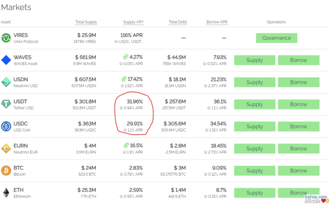你可以通过链上数据追踪到这些行为。 简单来说,Vires 是 WAVES 公链上的 AAVE 等价物,它目前管理了 USDN 总量的 70%(目前超过 6 亿 USDN)。 它还允许 USDC/USDT 的借贷业务。目前 Vires 平台上的 USDC 供应 APY 利率为 30%,这个利率目前超过了任何其他收益协议。