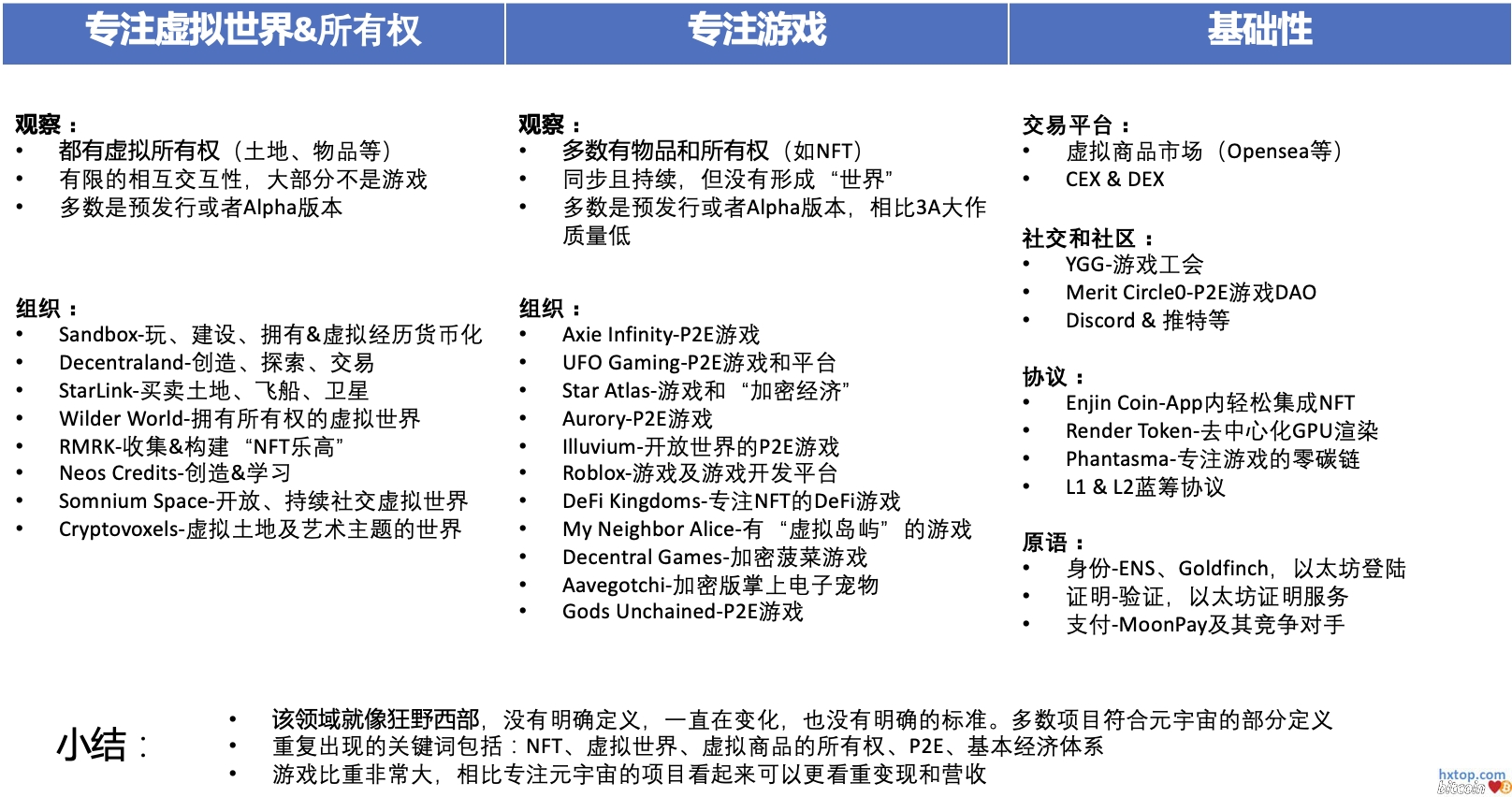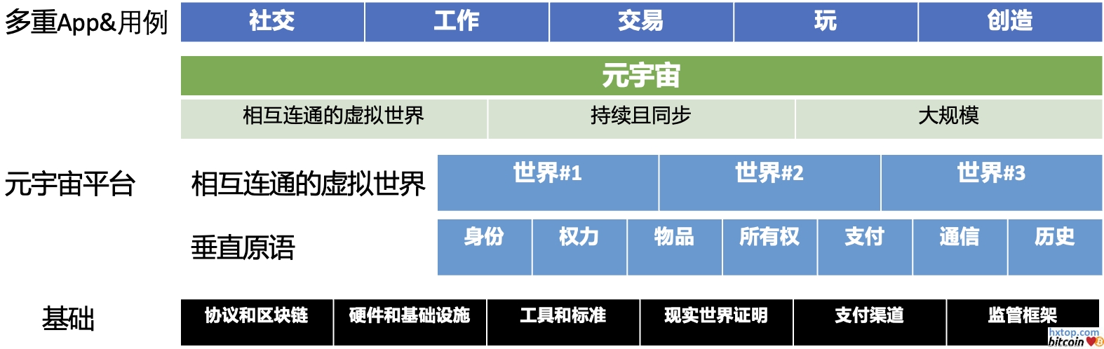 假设的未来元宇宙的“堆栈” 就像今天的互联网一样,元宇宙将依赖于硬件和基础设施、工具、标准以及监管框架——其中大部分尚未完全成型。 但与今天的互联网不同,元宇宙不会只有一个。将会有许多元宇宙,它们将相互连接。这就是为什么任何元宇宙都必须是去信任的(这意味着人们可以直接交互而无需通过中介),是无需许可的(这意味着任何人都可以在没有管理机构授权的情况下参与)。 为实现这一目标,元宇宙将依靠区块链在虚拟世界之间转移身份和所有权,通过证明来验证它们,建立支付渠道允许人们在去中心化经济中买卖和赚取收入。 当前谁在创建元宇宙?虽然我们还不能构建任何接近完整元宇宙的东西,但不同的公司和组织正在试验它的不同元素。大多数属于以下三类: