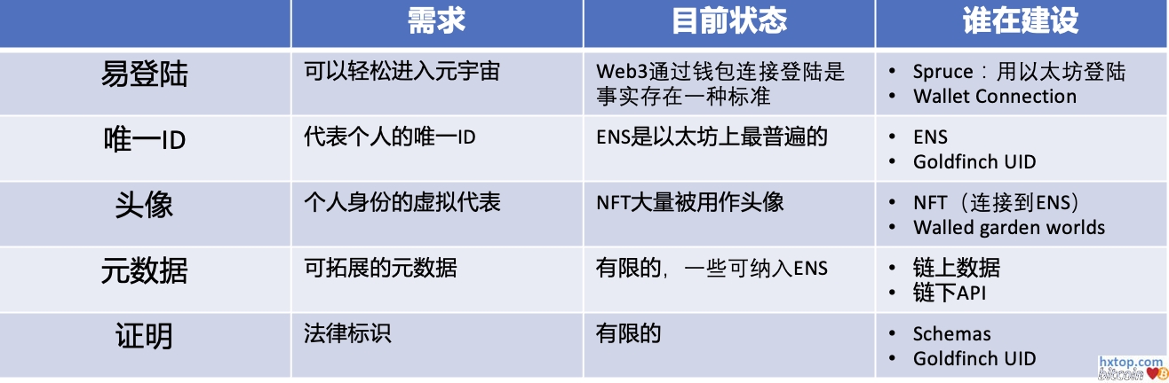 元宇宙生态系统仍处于起步阶段:新兴但尚未定义。这也是它的魅力所在。现在人们非常关注游戏,主要是因为它很容易变现。但我们马上就要开始看到未来可能是什么样子。 身份身份决定了你是谁,你可以访问什么和做什么,以及你在元宇宙世界中的代表方式。 在元宇宙中,我们的身份必须包括简单登录、唯一的 ID、代表我们的头像、跟随我们的元数据以及证明,以便我们可以证明我们是谁。这是目前每个部分发展的阶段: