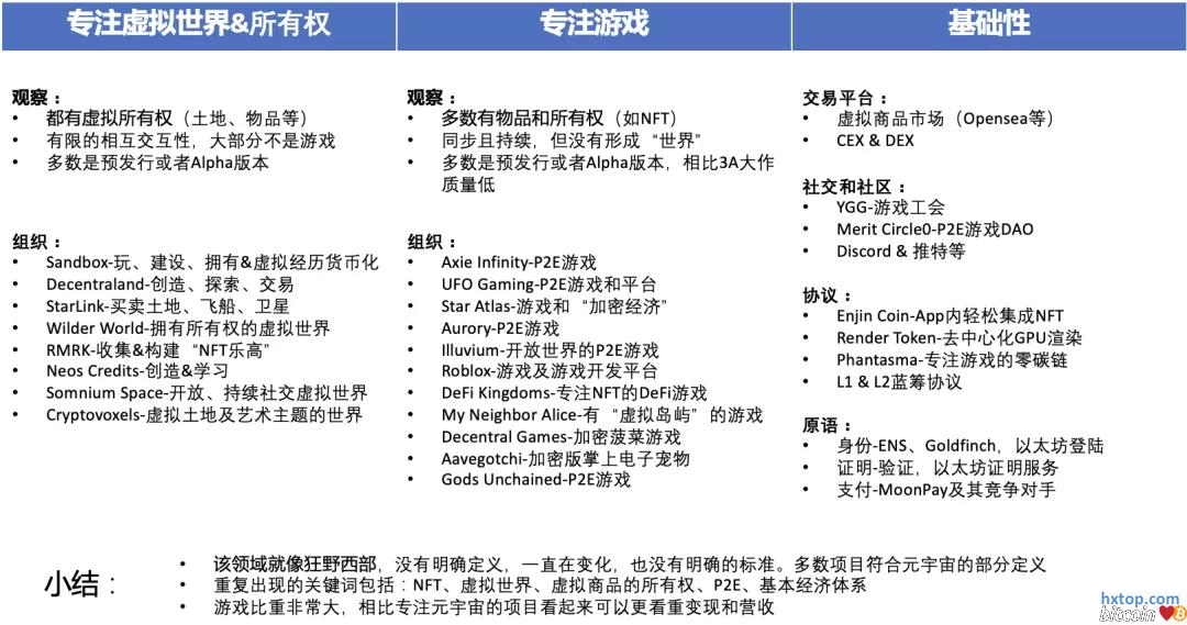 假设的未来元宇宙的“堆栈” 就像今天的互联网一样,元宇宙将依赖于硬件和基础设施、工具、标准以及监管框架——其中大部分尚未完全成型。 但与今天的互联网不同,元宇宙不会只有一个。将会有许多元宇宙,它们将相互连接。这就是为什么任何元宇宙都必须是去信任的(这意味着人们可以直接交互而无需通过中介),是无需许可的(这意味着任何人都可以在没有管理机构授权的情况下参与)。 为实现这一目标,元宇宙将依靠区块链在虚拟世界之间转移身份和所有权,通过证明来验证它们,建立支付渠道允许人们在去中心化经济中买卖和赚取收入。 3当前谁在创建元宇宙?虽然我们还不能构建任何接近完整元宇宙的东西,但不同的公司和组织正在试验它的不同元素。大多数属于以下三类: