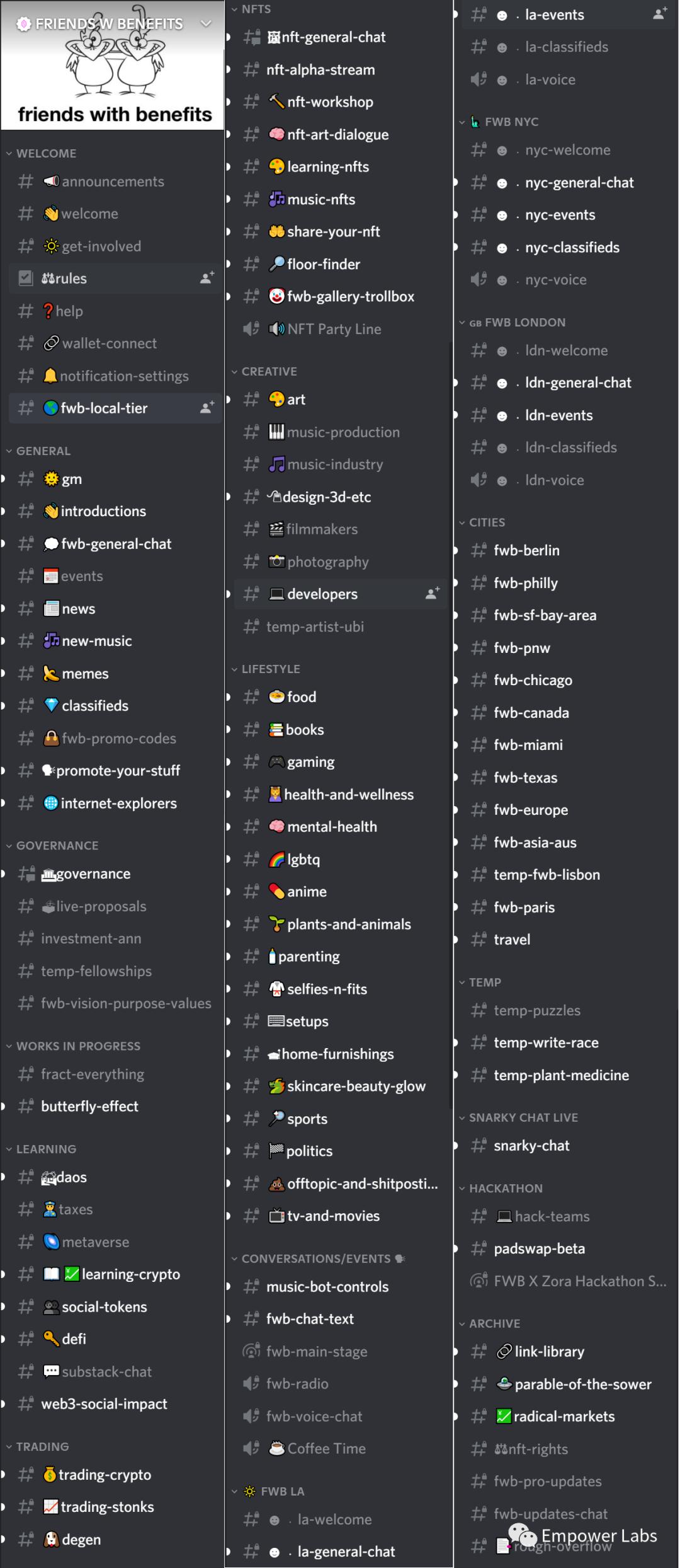 FWB 主要据点是在 discord,它拥有一个有着一百个频道的服务器,每天产生大量的讨论和交流。学习区、艺术区、创意区、交易区、生活区,包含音乐、游戏、电影制作、技术学习,市场信息到美食等大量频道。如果试图用 DAO 的方式去理解它,可能会非常困惑,这里面几乎看不到什么组织结构。这不就是个大聊天群吗?事实上它还真是。