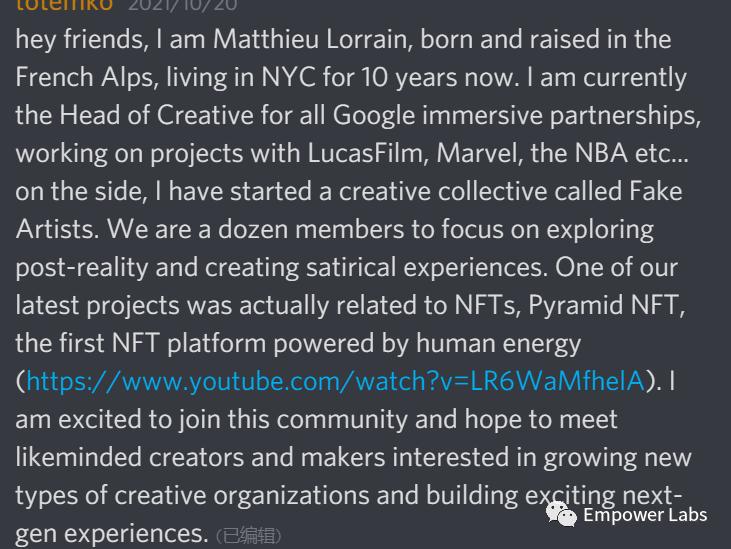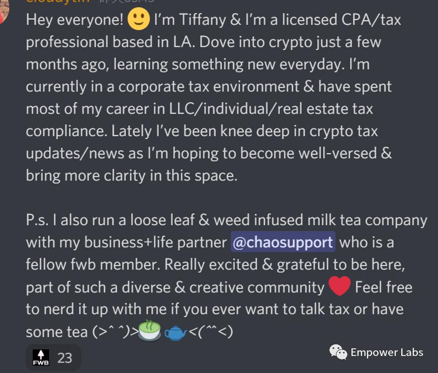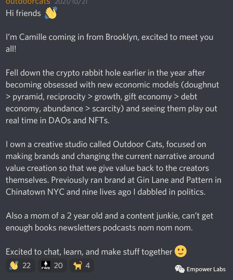 而通过委员会的筛选只是第一步,要加入社区还必须持有门票 (一定数量的社区通证)。并且价格不低,差不多一万美金的样子。这看起来是个加密版的富人俱乐部?曾经不是,但现在可能还真有点这个意思。 FWB 俱乐部作为一个有着浓重艺术范的私人俱乐部,FWB 里的成员和其他社区很不一样。懂 Crypto 的人只占很小一个比例,更高比例的是创意工作者,艺术家,传统创业者,不过大家都对 web3 有浓重的兴趣。 在 FWB 里天天能看到的新成员介绍都是这类画风。