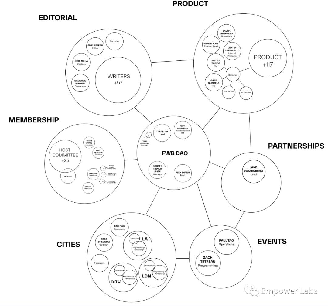 FWB 的定位并不是一个生产力组织。但即使这样,在过去的运营过程中也逐渐形成了一些产品,并且更多的创新也在进行中。FWB 的产品主要和文化社交相关 · 每周文摘– 一个内容产品,有点 newsletter 性质,包含社区里发生的有意思的事,重要的讨论,并把这些讨论和社会动态结合起来进行评论。 · 半成品 - 同样是个内容产品,产品的名字就叫半成品。低频更新,里面包含一些关于文化、Web3 和未来的思考。每一篇文章还会单开一个频道供会员进行讨论,而所有的讨论内容最终也会被加到文章中,作为内容输出的一部分。 ·Gatekeeper - 一个用于在线下活动中验证链上身份状态的应用,被使用在所有 FWB 线下活动中。 ·画廊 - 一个 NFT 展示及拍卖平台。 ·FWB 大学 - 一个 Web3 培训产品,尚未上线。 ·各类 Event – 无论是线下还是线上,各类的 Event 其实也是 FWB 的核心产品。 在 BanklessDAO 里我们看到,成员聚在一起后出现了热烈的讨论,并且迅速形成了很多由公会推进的项目。在 FWB 里,这么多有意思的人在一起,就没碰撞出什么吗? 有的,而且更多。但在 FWB 里,成员碰撞出来的 idea 大都自己组合下资源直接开干了。并不会等 DAO 的资助或者纳入 DAO 的框架进行协作。实际上 FWB 里已经至少碰撞出了几十个项目和新的 DAO。尤其在过去的 NFT Summer,这帮人更是如鱼得水脑洞大开,恨不得 24 小时都在搞新项目。 FWB DAO 的组织截止到 9 月初完成 1000 万美元融资的时候,FWB 只有一位全职员工。 但它有超过 2000 个成员,成员里有大约 200 个贡献者,并形成了 31 个承担重要职责的活跃贡献者 (lead)。 他们通过七个不同方向的分工,构成了 FWB 的组织结构。
