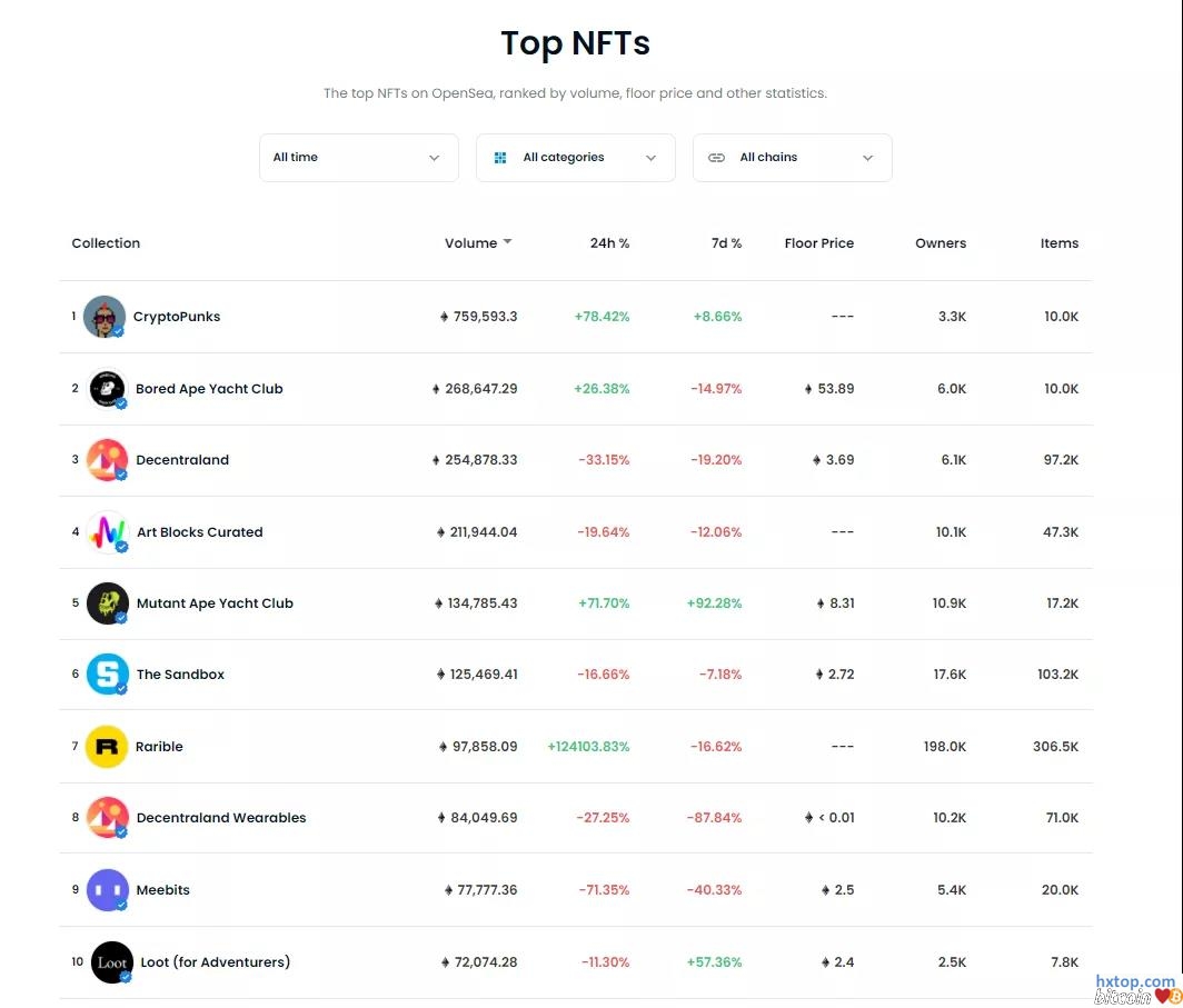 但与 CryptoPunks 在还未步入 NFT 爆发起来的 8 月时其地板价便已超过 20、30ETH 不同,BAYC 在 7 月时其地板价甚至还不到 5ETH。这个在 4 月 23 日才发售的 NFT,在首次发售时还卖不完,直至到 5 月初时,在 NFT 早期收藏家 Pranksy 宣布购买了 250 多个 BAYC NFT 后,其用户和销量才迎来较大增长。 而 BAYC 的成功并不源于 Pranksy 的“喊单“,而是通过将购买了 NFT 的用户迅速笼络了起来,并发展成为了一个庞大且有趣的社区。正如 BAYC 中的 “club” 一样,社区就像是一个俱乐部,用户将其社交头像换成 BAYC NFT,用户彼此间会互相聊天,互相关注。BAYC 团队非常注重社区之间的活动和社区成员与成员之间的互动,推出过 BAYC NFT 持有者专属的涂鸦创作浴室,在 The Sandbox 上购买土地让其成为持有者用户的独特娱乐场所,在 Decentraland 上开展虚拟聚会等。正是社区文化,让 BAYC 能发展并成为 NFT 中仅次于 CryptoPunks 的存在。 除了 BAYC NFT 之外,BAYC 团队还为了让更多的用户参与进来建立或衍生出了一些额外的和猴子相关的项目,如 Mutant Ape Yacht Club、Ape Kids Club 等。曾经在 OpenSea 还出现过在 24h 交易量排名前十被多个猴子项目霸榜的情况。