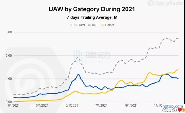 另外,微软正在测试的第一个元宇宙产品,则是主打能提供数位化身份功能的 Teams 聊天与会议式的一个应用,预定明年上半年正式推出,客户将能在虚拟世界中共享诸如 PowerPoint 这类 Office 办公应用的功能。 而加州大学伯克利分校更是把毕业典礼搬到游戏中,在《Minecraft》(我的世界)里将校园重建,毕业生们以虚拟形象齐聚校园参加毕业典礼。由此,元宇宙不再是闲暇时间的消遣或者逃避真实生活的虚拟港湾,而是越来越成为现实的延伸。 元宇宙热度外溢,引发 GameFi 热潮 值得一提的是,游戏是元宇宙的一个关键呈现形式,如同第一代互联网的入口是搜索引擎、第二代互联网的入口是应用程序一样,元宇宙的主要入口被普遍认为是游戏,而这也引发了今年加密领域另一个赛道区块链游戏 / GameFi 的热潮。 这一火热现象,也得到了 Footprint Analytics 的数据佐证。在 2020 年,NFT 投资项目类别中关于游戏类的 NFT 投资数量还排在末尾,而在今年游戏类已大幅增长至首位,并占据了所有投资项目数量中近 13% 的份额。2021 年,机构对区块链游戏的需求和兴趣正在不断增加,VC 甚至总计投资了 40 亿美元用于支持基于区块链的游戏及其底层基础设施的开发和创建。 另据 DappRadar 2021 年区块链游戏报告数据,截至年底,目前每天已几乎有 140 万个 UAW(独特的活跃钱包) 与游戏 Dapp 互动,占到了行业总使用量的 49%;单就 Splinterlands 和 Alien Worlds 等头部游戏而言,其 Dapp 平均每天就吸引超过了 20 万个 UAW。而在交易量上,游戏 NFT 则占到 2021 年 NFT 交易总量 230 亿美元的 20%。
