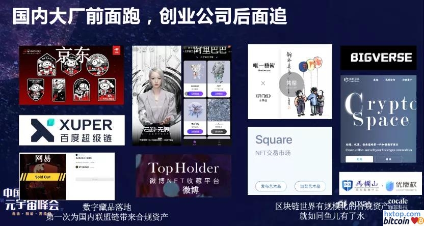 另外,小红书和至信链也建立了很好的合作,小红书基于至信链共建了数字藏品平台,小红书的入口优先级很高,如果你有藏品的话可以在个人主页看到一个R-Space入口。 以前大家说小红书里都是精致的小哥哥、小姐姐,在里面展示各种各样好吃的食物、好玩的东西,不久之后这些用户就会开始分享数字手办、数字藏品、数字商品,这是非常好的场景,小红书也是非常适合数字藏品业务的平台。 国内的NFT业务格局及数字藏品落地的意义在Wbe3.0的发展上,我们几乎是全面落后与西方的,但是值得庆幸的是我们在NFT赛道上看到了国内市场开始活跃,开始有我们中国力量下场, web3.0价值互联网中国并没有缺席,国内格局目前是大厂在前面跑,创业公司在后面追,京东、阿里巴巴、百度、网易、微博等等巨头无一缺席,而且我们也惊喜的看到,有一大批创业公司开始涌入这个赛道,有了好的VC有了好的创业者,中国的Web3未来可期。