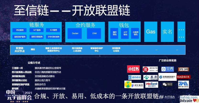 比如说互动娱乐,目前游戏是线上世界最大的互动娱乐方式,但用户花了钱买到了道具,在用户协议里居然规定,游戏道具并不属于用户而是属于这家公司,这是比特世界(数字世界)的现状,但在原子世界不是这样的,我花8块钱买你流水线生产出来的水杯,这个水杯一定是属于我的。 数字世界存在一个窘境,我们没有一项合适的技术来标记一个数字内容的权属,现在有了区块链技术、NFT技术,我们终于可以低成本标记用户对某一数字资产的权属,用户花钱买到的商品,哪怕是一个纯数字化的商品,这个东西也会完全属于他自己。所以,一旦实现了数字商品的物权标记和转移,这在互动娱乐或在游戏生态中是会有很多有意思的改变的: (1)用户会有获得感和真实的收益,道具属于用户后,未来在合规的框架下玩游戏,把游戏的道具玩得等级很高,一个更有钱的玩家买走道具用户是可以合法的获得应得的收益,这也是一种 play to earn模式。 (2)基于链的游戏道具,可以在多个不同的游戏之间流转,这种在互动娱乐的生态下会变得非常有意义,可以想象一下打通了多个游戏,大家的道具可以在多个游戏里流转,不同的IP可以在同一个数字空间(同一个同屏)出现。这不就是斯皮尔伯格先生的《头号玩家》么,大量的不同世界的IP内容同时出现,只不过我们暂时没有VR眼镜和头盔而已。AR、VR是生产力型的技术,一定会有技术突破的那一天,但区块链生产关系型的技术,是难以被直观理解,具备反常识反直觉特点的技术,所以,这类技术要反而要先行,要有战略布局,同时生产力技术一定是建立在关系型技术铺垫好的基础设施之上的。 所以,我们认为互动娱乐会是区块链技术落地破圈的重要方向,上述描述的场景在合规的框架下都是可以实现的。 除了游戏道具外,权益凭证,各类的门票、电影票、会员卡、域名、商标等都可以用非同质化通证(NFT)技术来标记。 近期我们也在和一些金融机构沟通,他们有大量的合规金融资产,看是不是可以放在区块链上做合规的上链,上链后做合规框架下的流转。 比如说保险单、金融合约以传统纸质的方式流转非常容易丢弃和篡改,如果以信息化的手段承载,流转为很受限,放在链上打通的是线上的生态,对金融的效率有很大的提升,是非常好的场景。 至信链的介绍简单介绍一下至信链,现在目标是成为一条合规、开放、应用、低成本的一条开放联盟链,服务分成两部分: