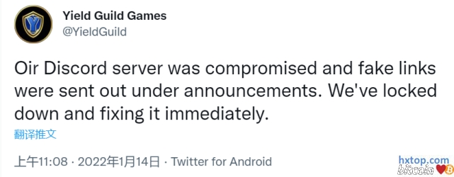 1月14日消息,游戏公会 YGG 官方称 Discord 服务器遭受黑客入侵,并在公告下发送了虚假链接。目前 YGG 团队正在紧急修复。