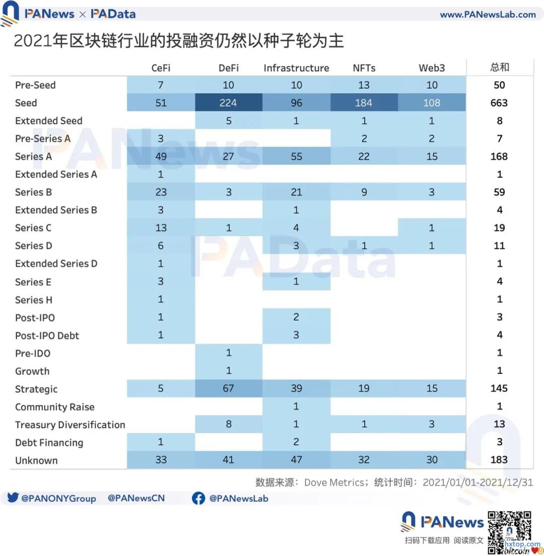 2021年区块链行业可谓欣欣向荣。根据CoinMarketCap的记录,2021年数字货币市场的总市值从1月1日的7557.40亿美元扩大至12月31日的22486.68亿美元,全年涨幅高达196.27%。水涨船高之下,大部分数字货币的收益也十分可观。 二级市场整体向好的同时,一级市场同样欣欣向荣。据PANews数据新闻专栏PAData统计,全球区块链领域的投融资在2021年继续保持了高速增长,全年吸引了超300亿美金的资金支持加密初创企业。本文系2021年全年披露的投融资事件回顾,核心发现如下: 1)全年共有1205个独立项目披露了1351起投融资事件,并总体呈现出“爆发-回落-再爆发”的“V”字形过程。其中,12月披露的投融资事件达到153起,为全年最高。 2)全年披露的融资总额为305.1亿美元,总体上,投融资总额随着时间的推移而增长,至11月达到年内峰值,约为50.98亿美元。 3)融资事件中有663起都是种子轮、168起是A轮,145起是战略投资,三者合计占比约83.56%,其他轮次的投融资事件都较少。值得关注的是,CeFi和Infrastructure这两个领域出现了较多C轮以后的融资。 4)DeFi的投融资事件数量最多,但总金额最低,CeFi的投融资事件数量较少,但总金额最高。NFTs和Web3作为相对较新的领域,披露的投融资总额也分别达到了36.1亿美元和22.1亿美元,高于DeFi。 5)从主要的次级细分领域来看,Gaming(游戏)共披露了141起投融资事件,累计总额达到35.28亿美元,这两个数据都居所有次级细分领域之首,毫无疑问是2021年最受资本青睐的。这些Gaming项目大多与NFTs相关联,部分与Web3相关联。 6)27家主要投资机构中以Coinbase Ventures全年投资的数量最多,达到96起,涉及93个独立项目。其次,Alameda Research、NGC Ventures和Animoca Brands全年投资的数量也都在78起以上,涉及的独立项目在75个以上。 7)不同机构在投资领域中表现出了一定的差异性。比如,Coinbase Ventures投资最多的领域是Infrastructure,同样相对更重视这一领域投资的机构则包括Digital Currency Group、Dragonfly Capital、Kenetic和Binance Labs等。而NGC Ventures、Alameda Research、Polychain Capital、Defiance、Mechanism等则专注于DeFi领域。另外,Animoca Brands则基本专注于NFTs和Web3领域。 1205个项目披露了1351起投融事件, 总金额超305亿美元 根据统计,2021年共有1205个独立项目披露投融资情况。如果将同一项目在年内披露的不同轮次的投融资事件视为不同融资事件的话,那么,这些项目全年共发生了1351起投融资事件。其中,1月和2月披露的投融资事件较少,分别仅有39起和58起。此后,全球区块链投融资经历了一个“爆发-回落-再爆发”的“V”字形过程。 3月全球区块链领域的投融资事件共有148起,较上月环比增长了155.17%。4月至7月期间虽然投融资事件有所回落,但每月仍保持在100起以上。8月,投融资事件数量下降至85起,达到短期低点,随后开始逐月恢复。至12月,投融资事件达到153起,为全年最高。