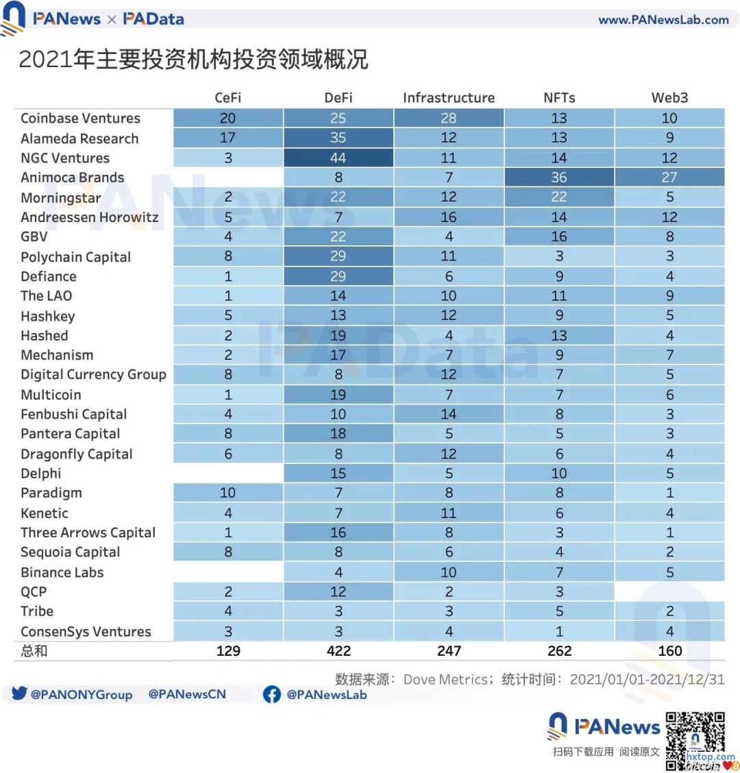 比如,投资数量最多的Coinbase Ventures投资最多的领域的Infrastructure,共参投28起,占比约为29.17%。其次是CeFi和DeFi,而较少投资NFTs和Web3。同样相对更重视Infrastructure领域投资的机构则包括Andreessen Horowitz、Digital Currency Group、Fenbushi Capital、Dragonfly Capital、Kenetic和Binance Labs,这些机构在这一领域的投资数量占各自投资总数的比重都较高。