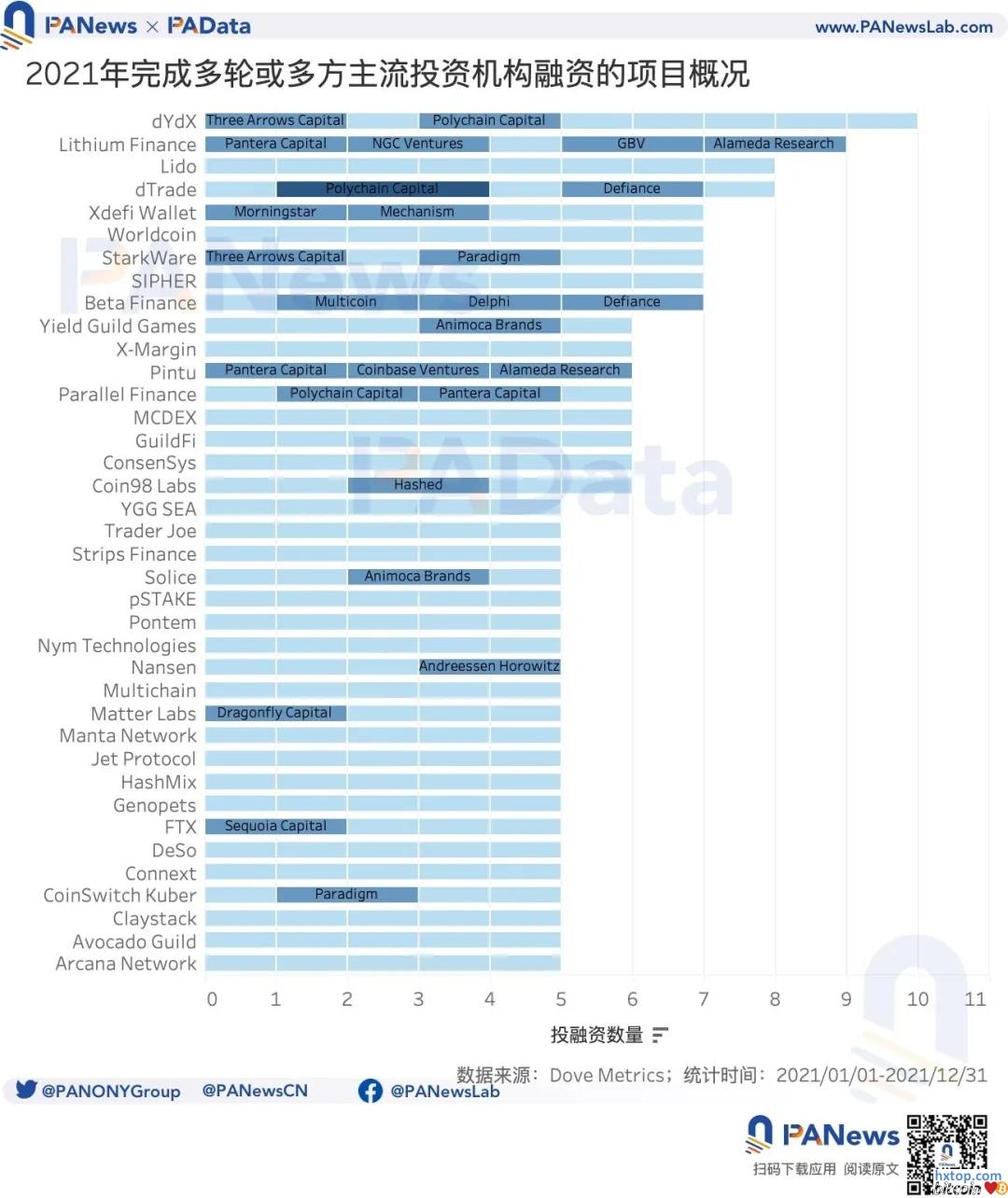 而NGC Ventures则基本专注于投资DeFi领域,共参投44起,占比达到52.38%。同样专注于DeFi领域投资的还有Alameda Research、Polychain Capital、Defiance、Mechanism、Three Arrows Capital等。另外,Animoca Brands则基本专注于NFTs和Web3领域,分别共参投了36起和27起,合计占比约为80.77%。同样关注这两个新兴领域的机构还有Andreessen Horowitz,分别参投了14起和12起。 从项目的角度看,2021年共有38个项目披露的投融资事件中包含5家主流投资机构(同一机构参投不同轮次则分别计数)。其中,dYdX共获得了8家观察范围内的独立主流投资机构的投资,包括Andreessen Horowitz、Defiance、Delphi 、Hashed、Hashkey、Polychain Capital、QCP 和Three Arrows Capital,其中Three Arrows Capital和Polychain Capital参投了不同轮次的投资,因此总计投资机构的数量达到了10家。