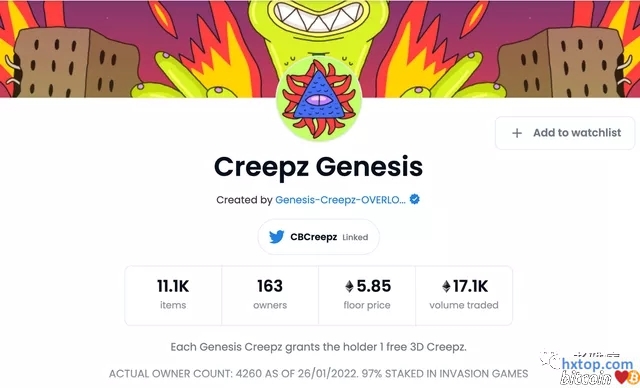 团队旨在将Creepz发展成为一个全球公认的大品牌。截止发稿前,持有者人数为163人,交易量达到17100 eth,地板价曾飙升至8.4eth,现已回落至5.85eth。