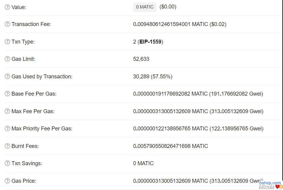 Polygon 上的 EIP-1559 交易示例 由于gas价格是由供求决定的,而且基础费用包括下一个区块的最低价格,因此预计交易费用不会降低。 然而,预计MATIC持有者将从这次升级中受益,因为MATIC拥有10B代币的固定供应。一项分析显示,年化销毁将是总MATIC供应的0.27%,导致通缩压力,使验证者和委托者都能在Polygon上处理交易中受益。 到目前为止,已经销毁了458个MATIC。 |