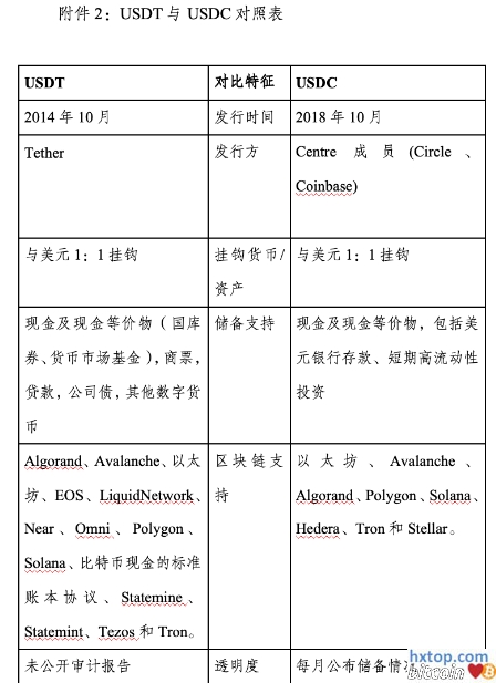 | 全球稳定币的现状与未来:基于USDT和USDC的分析 事件 2025年3月,作为美国主要银行业监管部门的货币监理署(OCC)、联邦存款保险公司(FDIC)相继表示银行无需审批可直接开展加密业务,包括加密资产托管、持有稳定币储备和加密支付业务,美元稳定币正加速发展。2024年7月,京东币链科技(香港)、渣打银行等五家公司加入了香港稳定币发行商“沙盒”项目,目前京东已进入香港稳定币发行沙盒测试阶段,预计香港的《稳定市条例草案》批准后,细则随之发布,港元稳定币或将面世。 摘要 稳定币与私人加密货币、央行数字货币同属于数字货币的重要发展方向。稳定币(Stablecoins)作为进行商业支付和结算的替代方式正迅速发展,其在效率、便利性、安全性及费用方面相较于传统方式颇具优势。目前市场上最受欢迎的两大稳定币为USDT(TetherUSD,也称为泰达币)和USDC(USDCoin),二者都为以法币为抵押、1:1挂钩美元、中心化的稳定币。法币抵押型稳定币比算法型更可靠。 总体而言,USDT比USDC发行更早,支持的区块链和活跃地址(参与链上交易活动的地址总数)更多;市场表现上,USDT的市值和流通量更大、可用性更高、更受小型交易者(零售用户而非机构)欢迎、交易相对小额多笔;安全性和稳定性上,USDT在储备资产透明度、审计和所有权方面争议较大,增长势头也有所下降。 未来,监管法规、算力效能和央行数字货币(CBDC)是影响稳定币发展的重要因素。虽然用户出于“博采众长”同时持有多种稳定币,多种稳定币也将受到监管并长期共存。但少数稳定币特别是法币抵押型稳定币会占据绝大部分市场。 以法币抵押的稳定币间接具有法币特征,美元稳定币的垄断无疑会强化美元霸权。对此,我国应做好应对,充分运用数字人民币研发经验积极探索人民币稳定币,助力人民币国际化。