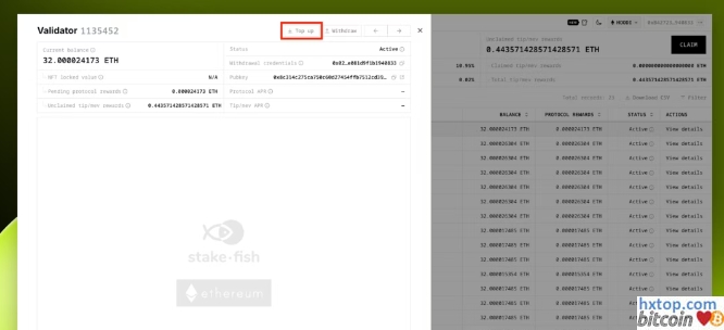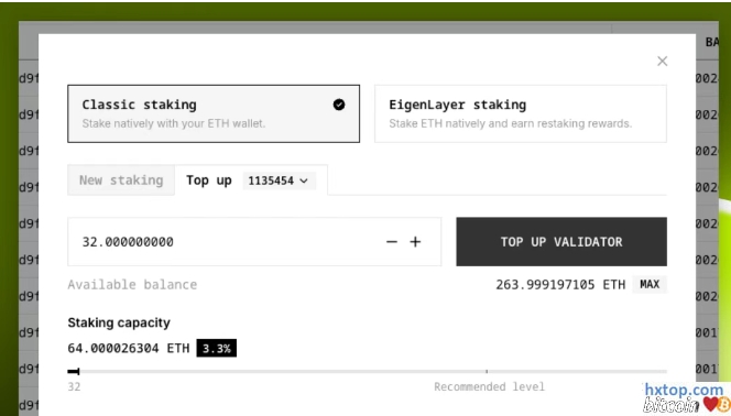 4)点击“TOP UP VALIDATOR”(充值节点),并从您的钱包中批准交易,等待交易被以太坊网络确认后,您的充值金额会被添加到对应的Validator中。 5)您也可以直接在Dashboard中,直接点击“STAKE MORE”,进入质押模式,在“Classic staking”选项卡中,选择“Top up”,对目标Validator充值。