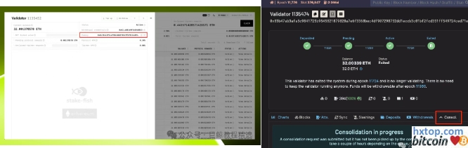 3)合并交易被以太坊网络确认后,您的合并操作即完成。 要查看Validator的合并状态,您可以在Validator列表中找到正在合并的Validator,点击“View details”,选择“Pubkey”,在beaconcha.in上查看此“Pubkey”对应的Validator的“Consol.”部分信息。示例:https://beaconcha.in/validator/2321#consolidations
